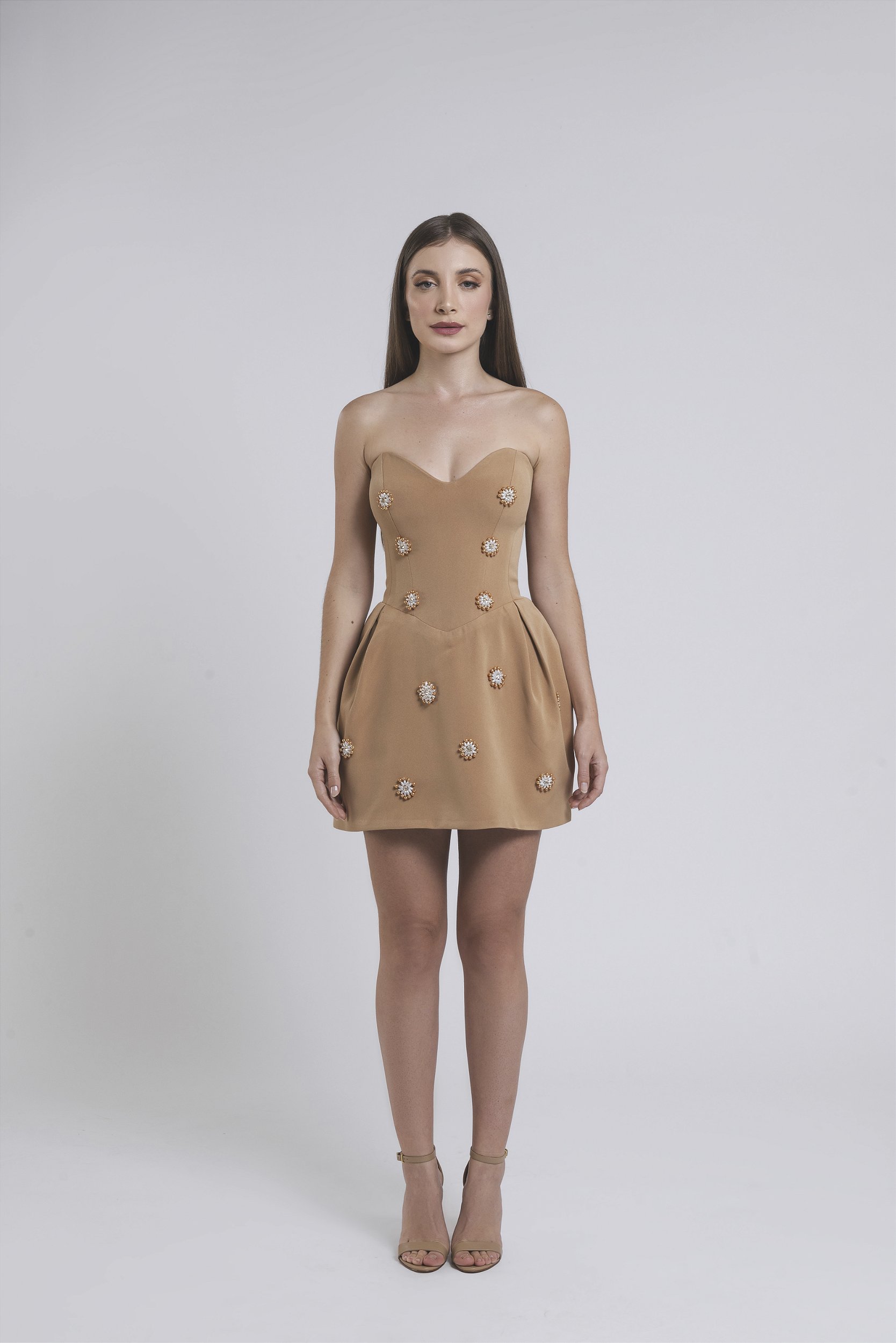 Vestido curto com estrutura corset, cintura alinhada com saia leve balone com pregas , com broches em pérolas e cristais feitos a mão e zíper nas costas.