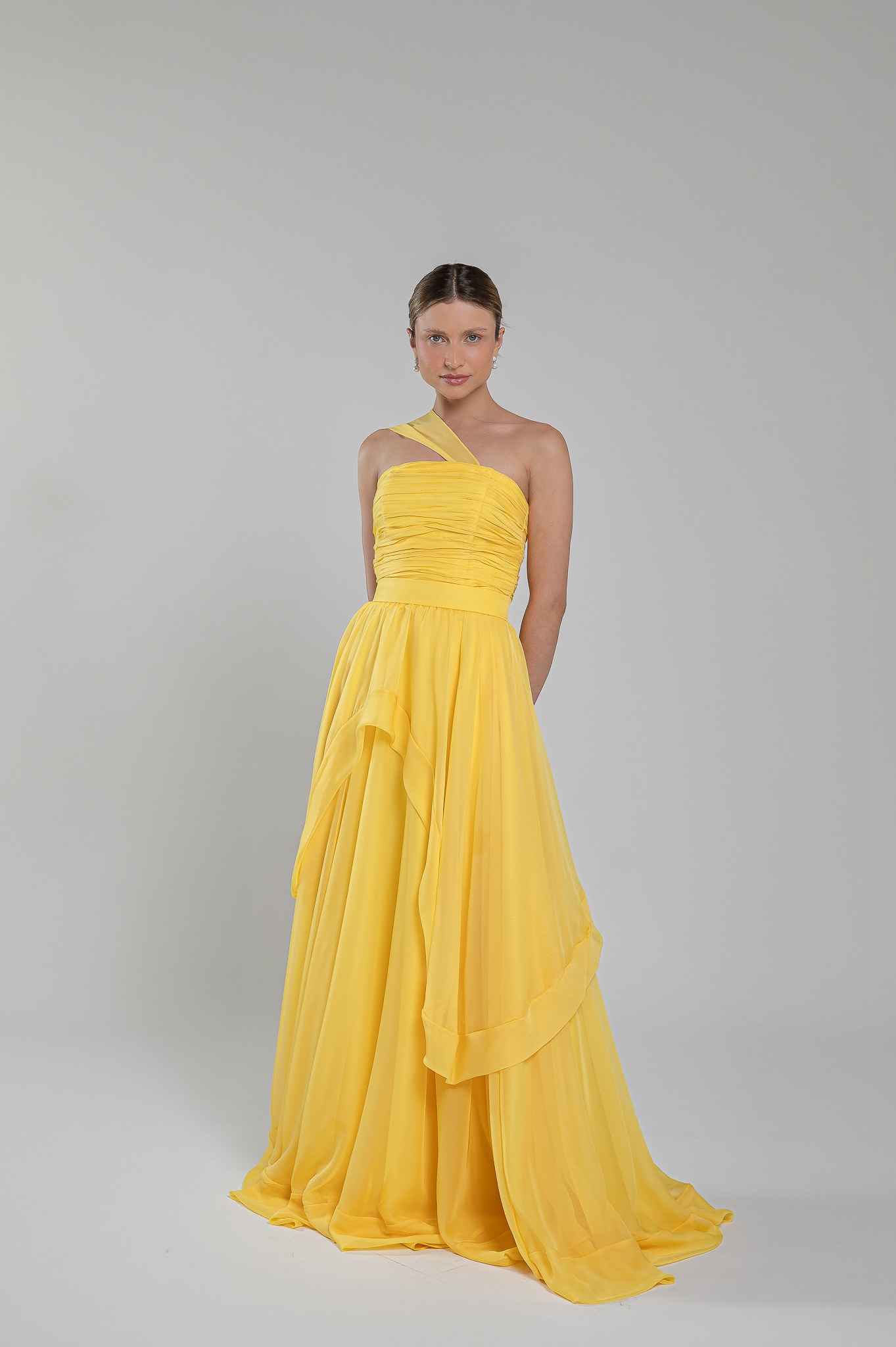 Vestido longo, fluido, tomara que caia drapeado á mão no busto, com um lenço saindo do decote, saia godê, uma sobressaia assimetrica e ziper nas costas.