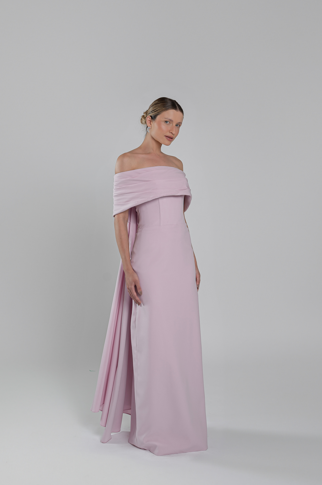 Vestido longo alfaiataria, em crepe importado, tomara que caia, com decote reto, pala drapeada removível que envolve os braços com capa saindo na parte de trás e ziper costas.